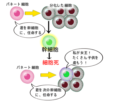 パネート細胞は腸の陰窩の深部で幹細胞(=Lgr5細胞)の隣に位置し、隣の細胞を「幹細胞にする」働きをします。女王バチは、ロイヤルゼリーで生まれますが、ロイヤルゼリーを作る細胞と言えます。慶應大学の佐藤博士が発見した日本の誇る研究です(文献)。