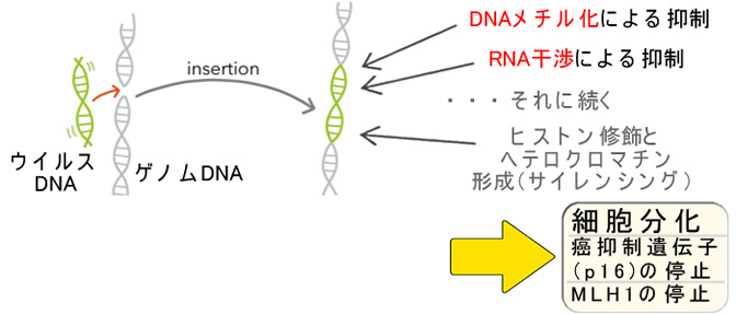 この現象は「潰瘍性大腸炎の原因はトランスポゾンらしい」という記事で書いたものです⇒本来、DNAメチル化(RNA干渉)は進化的にウイルス・トランスポゾンへの防御機構として生まれたと予想されています。これが、やがて自己の遺伝子も抑制するようになり(DNAサイレンシング)、多細胞生物の「細胞分化」を生んだと考えられています(The Cell 6版 7章)。しかし、これが過剰に働いで、p16を停止させて胃癌の原因になり(EBウイルス胃癌)、MLH1(DNA修復酵素)を停止させて「ゲノム不安定型大腸癌(CMS1)の原因(CIMP)」になります。