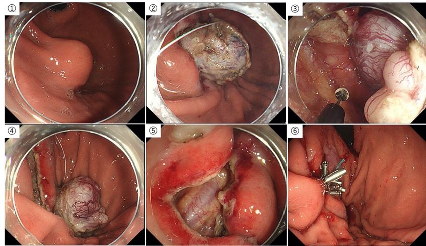 大腸癌でも、化学療法が著効するタイプがあります。CMS1型(=MSI陽性)は、抗原性が強くチェックポイント阻害剤が著効しますし、NTRK Kinase-Fusion(+)癌も分子標的薬が著効します。直腸癌の一部はHPVが関与しており放射線化学療法が著効します。理論的に「p53が正常(apoptosis経路が温存)」なら放射線化学療法が有効と予想されます。直腸癌の3分の1は、「放射線化学療法が著効するタイプ」であり(2022年文献)、このようなタイプには「リンパ節廓清をしない」のが、もう直ぐ標準になると思われます。直腸でなくてもTEMと同じ様な局所切除を大腸内視鏡で行う方法も試行されています(EFTR 下図)。