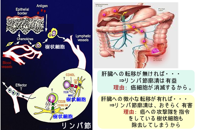 リンパ節の廓清が本当に有益なのでしょうか?リンパ節の中ではリンパ球が癌細胞と闘っています(詳しく書くと、樹状細胞が癌細胞の破片を貪食し交差提示により、ナイーブCD8T細胞を感作してCTLを量産しています)。進行癌の治療では人工的に癌に感作させた樹状細胞を投与しますが、癌が転移したリンパ節は重要な「樹状細胞」のたまり場ですから、これを除去することは負の側面もある訳です。最近は免疫チェックポイント阻害剤などの強力な免疫賦活剤が登場したことで、この問題を再検討する必要が出てきた訳です。