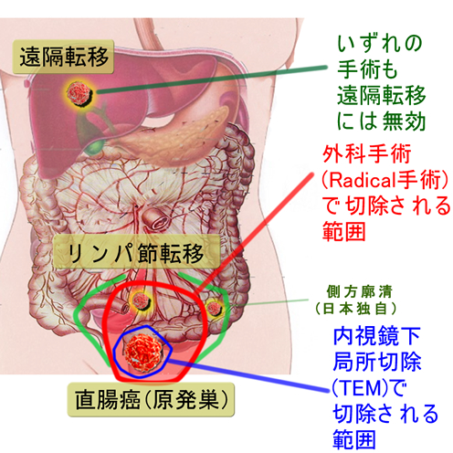 直腸癌(原発巣)を切除するだけなら外科(腹腔鏡)手術は不要ですTEM(径肛門的手術)という方法があります。これを「局所切除」と呼びます。対して開腹、腹腔鏡、ロボットなどのリンパ節廓清を伴う手術を「Radical Surgery」と呼びます。