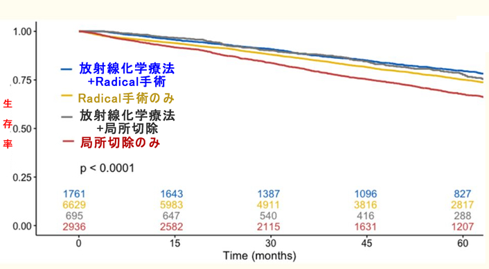一見してリンパ節廓清も放射線化学療法を行わない「局所切除のみ」は成績が悪いことが解ります。ですから外科的にリンパ節を廓清することは、確かに生存期間を延長する、と言えます。