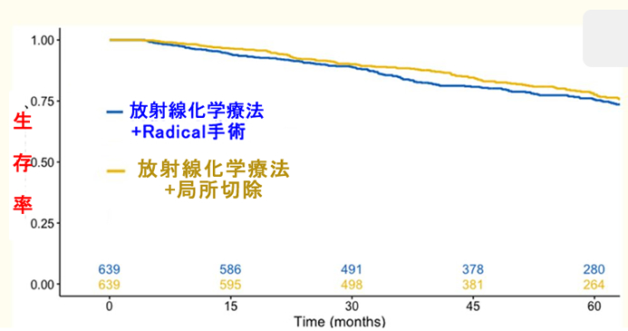 5年くらい経つと「放射線化学療法+局所切除」は「放射線化学療法+Radical手術」に劣るように見えます。しかし、このグループは高齢者が多いからで、「傾向スコアマッチング」という方法で年齢の影響などをで補正すると下図になります。驚くべきことに「外科的リンパ節廓清をしない方が生存が伸びる」という結果です。