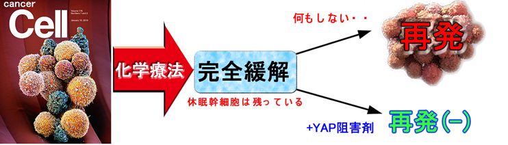 さて・・・ここからが臨床的に重要です。佐藤博士達は抗癌剤治療の後に「YAP阻害剤を追加」することで再発が減ることも報告しています。これはYAPの阻害により「休眠からの覚醒が阻止された」からと推測されます。このようなハイブリッド治療は今まで無かったもので革新的と言えます。