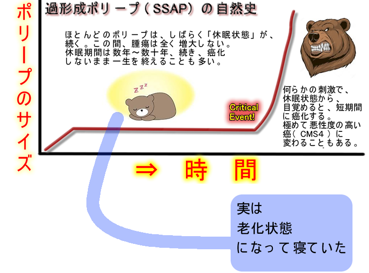 この問題は上記と同義な問題です。過形成ポリープ・SSAPは「老化状態」にあります。細胞分裂も細胞死も起こさず「無変化」のまま経過しますが、若返り(老化の解除)で急速に癌化します(⇒老化と大腸癌)。