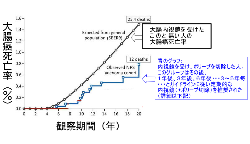 2012年米国で大腸内視鏡でポリープを切除することで「大腸癌死亡」の半分が予防できるという報告がありました( 下図 The National Polyp Study N Engl J Med 2012; 366:687-696.)