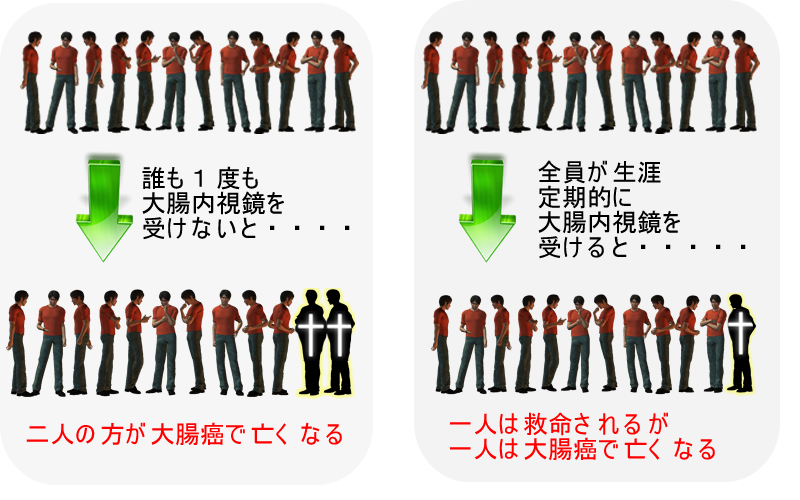 期待値として「1回(1日を費やしての)の大腸内視鏡で7日の命を得ることができる(6日の生存を得をする)」・・・・という計算になります。