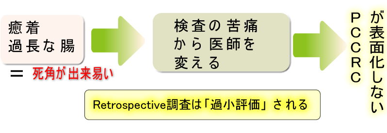 PCCRC-Rateは過去に2度以上検査を受けた方を調査するRetrospective法で算出されます。Retrospective調査は「PCCRCが表面化しにくく、かなり過小評価される」と考えます。PCCRCは過長・癒着で挿入の難しい症例に出易いからです(つまり患者さんが医師を変える事が多い)。実際、当院で見つかる他医療機関のPCCRCは、ほぼ全て挿入困難例です。