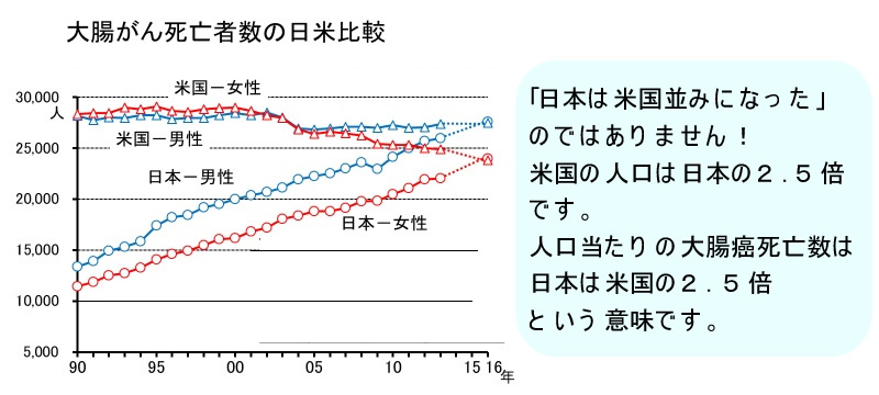 2016年、国立癌センターは「日本人の13人に一人が大腸癌になる(累積罹患率)」という驚くべき予測を発表しました(男性12人に一人、女性15人に一人 外部リンク資料)。大腸癌は成人病並みに「ありふれた病気」になった訳です。しかし米国では、大腸癌は減少しており減少した理由は「ポリープ切除の効果」であると結論されています。 では何故、米国並みに大腸内視鏡が盛んな日本で大腸癌が減らないのでしょう?ここに問題の核心があります。
