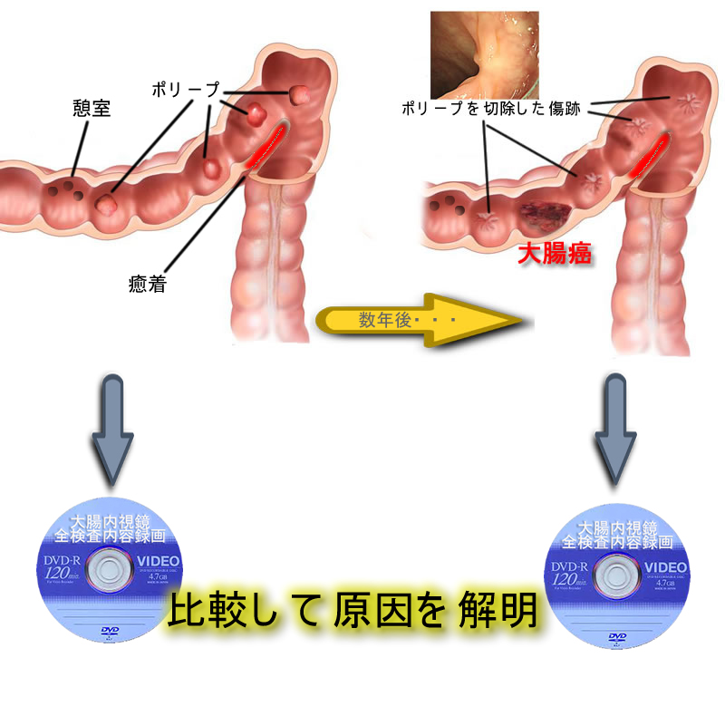 最新の検査の動画と、以前の検査の動画を比較することで、大腸癌があった場所に以前は何があったのか?が解明されます。