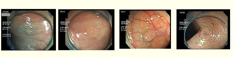 上の4枚は2〜4ミリの腺腫です。4枚とも「まだ良性」ですが、高度異型腺腫(グループ4)と言いまして「1年後には癌になっていたであろう」と予測される病変です。