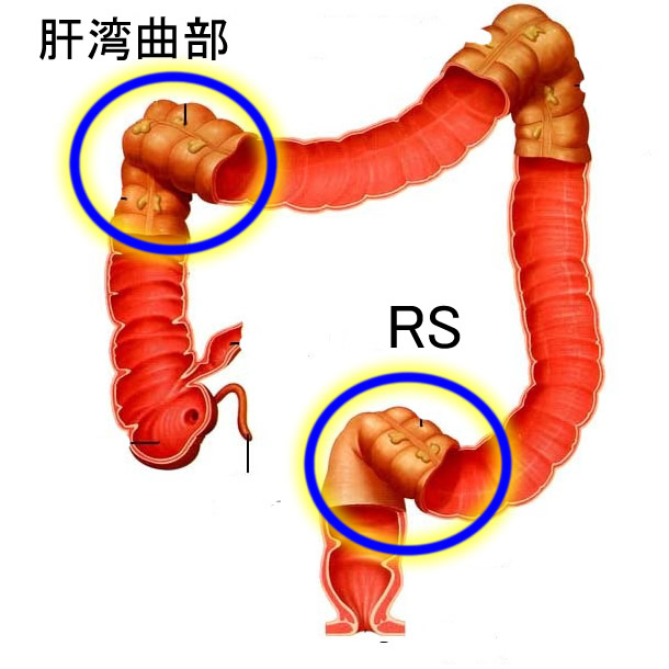 肝湾曲部とRSの体位変換・往復観察 肝湾曲(上行結腸と横行結腸の境界)とRS(直腸とS字結腸の境界)は大腸の観察で最も重要な山場です(下図の丸) どちらも強く屈曲しているために観察の死角が出来易いのですが、癌が出来易い部位でもあります。 この2か所を時間をかけてしっかり観察することが精度を上げるポイントになります。 (具体的には体位変換を組み合わせて往復観察をすることになります。私は「上行入れ直し」「Sの入れ直し」と呼んでいます)