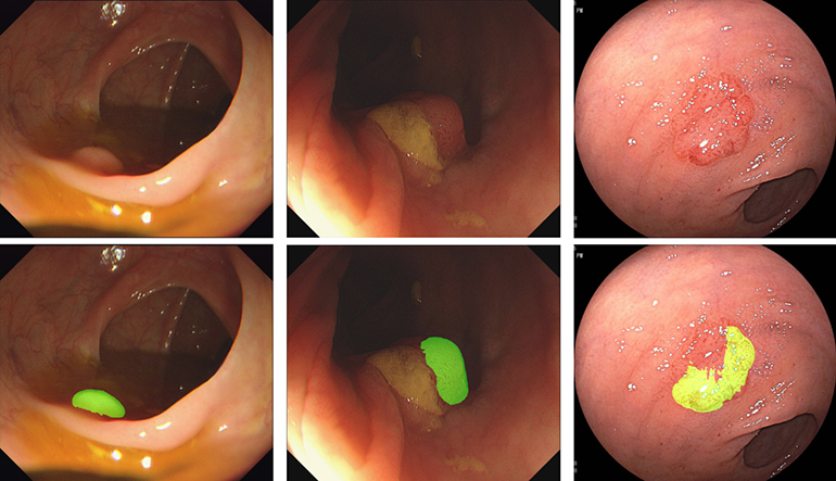 上段は通常の内視鏡。下段はAIがポリープを緑色で指摘した写真(これですと看護師の検出能力より遥かに劣ります)