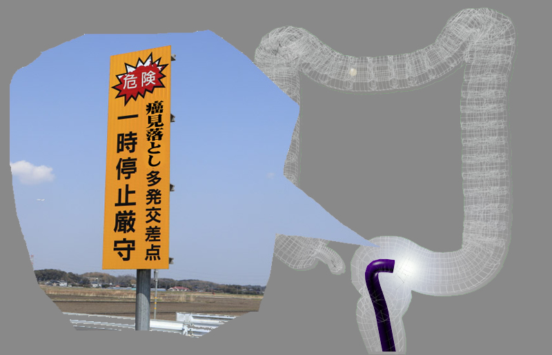 RS裏側への注意 RSというのは、直腸から入って直ぐのカーブのことで正確には「R(直腸)S(字結腸)境界部」と言います(下図) ここは (1)内視鏡を入れて直ぐのカーブである (2)抜去痔には、検査の最後なので、早く終わらせたいという心理的要因 ・・・で医師は急いで通過する傾向があります しかし、ここは「癌が多く、見落としも多い場所」です ここで「一時停止」をして「体位変換をしながら、数回の往復」をすることが重要です