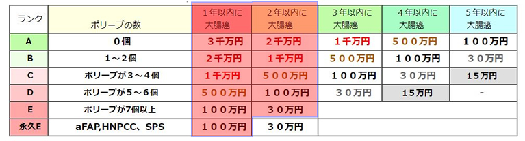 大腸癌A 0個 3千万円 2千万円 1千万円 500万円 100万円 B 1〜2個 2千万円 1千万円 500万円 100万円 30万円 C ポリープが3〜4個